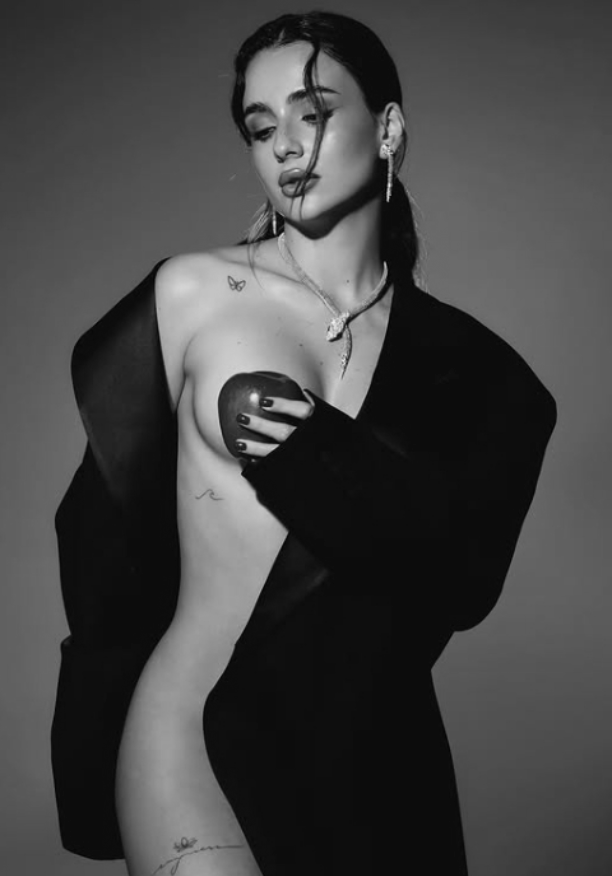 Перед камерою постала повністю оголеною. З одягу на ній був лише подовжений жакет чорного кольору. Груди артистка прикрила червоним яблуком.