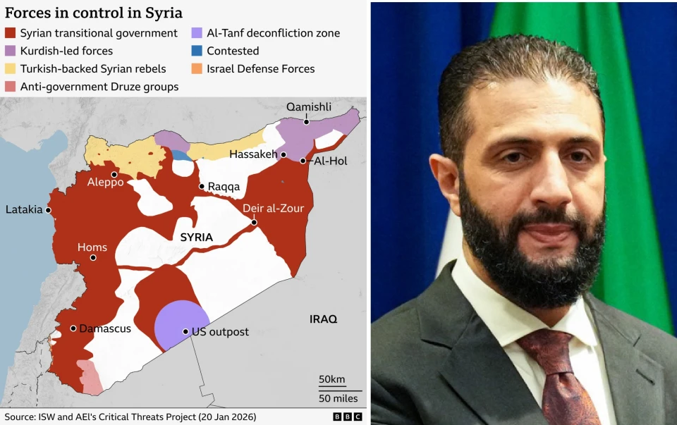 зміна ситуації у Сирії та тимчасовий президент аш-Шараа, фото: BBC та ВікіпедіяЩе на початку січня урядові сили захопили курдські квартали в Алеппо (Шейх-Максуд та Ашрафія), після чого курди відступили на північний схід.А вже 13 січня сирійські урядові сили розпочали наступ проти Сирійських демократичних сил, кістяк яких становлять курдські загони самооборони. Операції почалися у східній частині провінції Алеппо (райони Дейр-Хафір та Маскана). Згодом військові дії розширилася на провінції Ракка, Дейр-ез-Зор та Аль-Хасака.16 січня тимчасовий президент Сирії аш-Шараа видав декрет, що визнав курдів “невід’ємною частиною сирійського народу”, а курдську мову – національною поряд з арабською. Це був жест доброї волі, щоб заспокоїти курдів, гарантувавши їм принаймні культурну автономію. У підсумку курди пішли на зустріч. 18 січня аш-Шараа оголосив 14-пунктовий план перемир’я (за посередництва спецпосланця США Тома Баррака), за яким Сирійські демократичні сили інтегруються до сирійської армії та поліції, а курдські провінції Ракка та Дейр-ез-Зор передаються уряду негайно разом з нафтовими полями, прикордонними переходами та в’язницями ІДІЛ. Однак армія не входить до центрів Аль-Хасаки та Камішли чи курдських сіл. Тож Сирійські демократичні сили відступили на схід від Євфрату, уряд захопив ключові об’єкти (включаючи найбільше нафтове поле аль-Омар – найважливіший виробничий актив країни). 24 січня перемир’я продовжили на 15 днів для передачі полонених ІДІЛ до Іраку. На сьогодні сирійський уряд контролює до 80% колишньої території Демократичної автономної адміністрації Північної та Східної Сирії, курдського державного утворення, яке виникло внаслідок громадянської війни у Сирії. Тобто центральна влада повернула контроль над значною частиною ресурсів і території, що раніше контролювалася курдами.Чому така різка зміна стала можлива? Кілька факторів:Вдалий наступ став можливим завдяки військовій перевазі урядових сил після падіння режиму Асада та реорганізації сирійської армії;Підтримка Анкари, яка бачить в курдах загрозу, адже чимало з них проживає в Туреччині;Але найважливіше – зміна позиції США, які використовували курдів у війні з Асадом, а тепер залишили їх напризволяще. Спецпосланець Том Баррак заявив, що сенс існування Сирійських демократичних сил проти ІДІЛ вичерпаний, а найкраща можливість для курдів – інтеграція до уряду аш-Шараа. Адміністрація Трампа раніше підтримала аш-Шараа, знявши санкції та включивши Сирію до анти-ІДІЛ коаліції.Як наголошують у New York Times, після місяців переговорів, “терпіння аль-Шараа, схоже, вичерпалося” і він вдало розрахувавши момент і свої сили, здійснив успішний наступ. Думки експертів: чи стане тепер Сирія сильною державою, як Туреччина